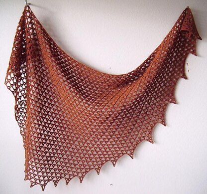 It is a bottom-up, side-way, asymmetrical, semi-circle shawl. The stitch pattern consists of only V-stitches and chains. Any yarn and colours will be great for it. Gauge is not important.