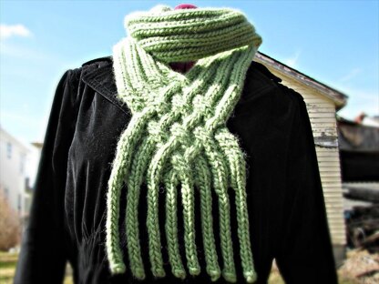 The ribbing progresses in two separate parts from the focal point - a beautiful, large cable, which keeps it all “fastened” around the neck. The cabled section then flows seamlessly into an unusual I-cord fringe.