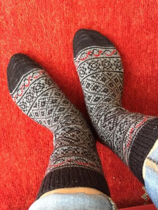 Socks are knitted top-down and foot length is fully customisable. The sample socks are in the medium size, using Travelknitter BFL Supersock in Laneway City (charcoal), London Skies (grey) and Firecracker (red). You'll only need a tiny amount of yarn (5g or less) for the little contrast detail at the top of the ankle and the toe.