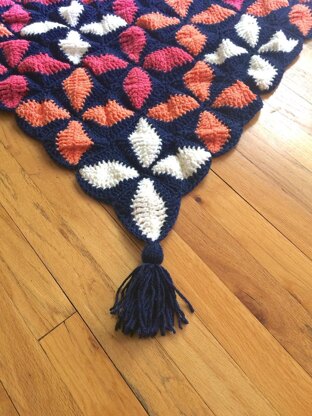 Transport yourself back to the 1950’s when graphic shapes like boomerangs, stars and atoms were all the rage. You could fine these shapes on barkcloth fabric, countertops, glassware and furniture. Remember the boomerang coffee table? This simple 2 round repeat granny square is reminiscent of leafy shapes found on fabrics from that era. Four small squares join to make one larger square for a fun project. Tassels on each corner add whimsy to this unique throw.