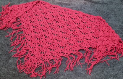 Hello, I call this my retro shell shawl because I’ve been making it since the early 70s, when I was about 13 years old. I expect I had a pattern for it once, maybe, but it has been changed and adapted and forgotten and re-worked-out and remade so many times since then I’m sure it’s mine now. I made one for a friend, then was asked for another by another friend, then made myself one, then said yes, I’d make more if people bought me the yarn, then started charging to make them! Over the years I must have made dozens, they go out of fashion and come back in and I find one, wear it and it starts again. Recently I dug one out, worked out a pattern again, made some and here it is for you to try. Enjoy.