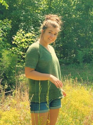 Reverie is a top-down v-neck pullover with short sleeves and an A-line body. The sleeves and bottom edging are enhanced with a lace detailing and the neckline is finished with an I-cord edging. This pattern is available in eleven adult sizes and is perfect for wear as either a casual or dressy garment during most seasons of the year. This sweater includes a 4-inch (10 cm) positive ease that is built into the instructions. Please choose the size listed in the pattern that is closest to your actual natural bust size.