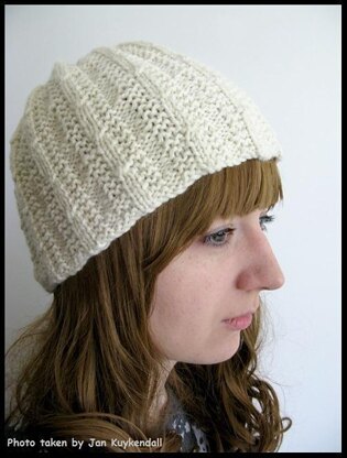 This hat is made in one piece from the bottom up. It has ribbing with a simple cable twist pattern that doesn't require a cable needle. It is the same on the inside and outside so it is fully reversible.