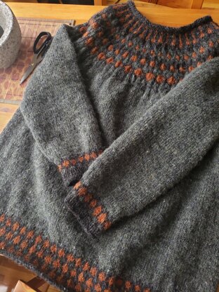 For this pullover I have drawn the inspiration from the traditional Icelandic colorwork patterns but it is worked from top down to give opportunities for length modifications. Knitted in genuine Létt-Lopi wool, it is warm in cold arctic climates.