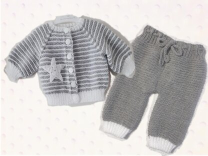 This is a versitile cardigan and pant suit. The cardigan is knitted top down and can be either plain or stripes To fit 0-6 months Stretchy garter stitch is ideal for babies Easy to knit clear pattern instructions