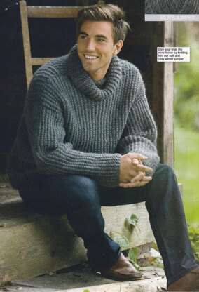This is a pattern for a Rib Roll Neck Jumper, originally published in Knit Today. It is a simple shape in a rib stitch with a roll neck, drop shoulders. Photos Knit Today.