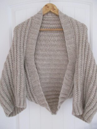 This is a pattern for a Rib Shrug, originally published in Knitting magazine. It is a simple shape in a rib stitch with rib edging. Full length cuff to cuff 116-136 cm Length 50-54 cm not including edging.