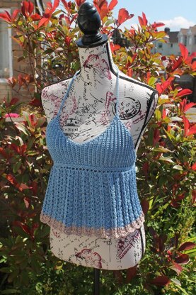 Summer halter neck top with ribbed bust section and lace bottom section.