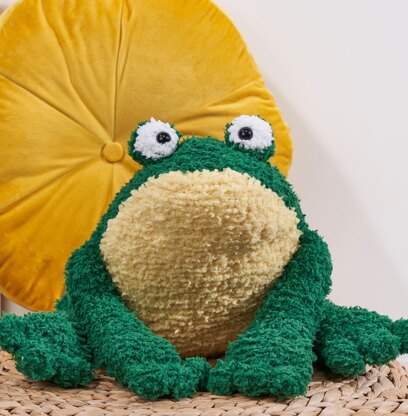 Ribberto is a sometimes grumpy frog, but is very partial to cuddles! The frog pieces are knit in garter stitch in a fleecy chunky yarn, which creates a super soft textured fabric. Designed by Amanda Berry @fluffandfuzz, the frog is knit in chunky weight yarns on single pointed needles (not in the round). For confident beginners and above, other techniques used include casting on and off, knits, increases and decreases, and seaming to finish.