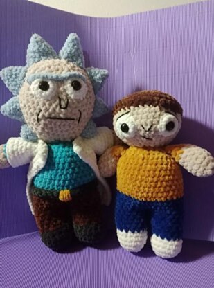 This pattern uses Kismet Velvet, though any Size 6 yarn will work. Materials: 100 yards of beige yarn. 80 yards of yellow/blue/navy/brown/white yarn. 20 yards of light blue yarn. Black yarn for embroidery. Stuffing. 4mm hook. 18mm safety eyes. Darning needle. Scissors. Your Rick will measure about 30cm tall and Morty about 25cm.