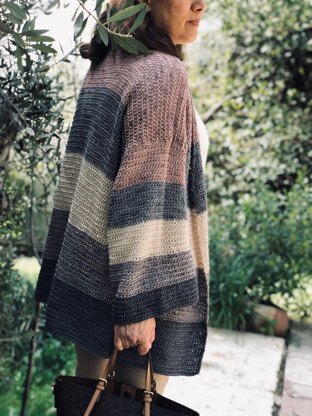 Ridges Cardigan is knit flat, bottom up, and the shoulder seams joined with a 3-needle-bind-off. The 4” (10cm) positive ease, dropped sleeves, and the light fingering yarn makes it the perfect companion for mild summer nights. The stockinette rigde pattern is easy to follow and gives a lovely, squishy texture. This boxy style cardigan has a wide V-Neck and no sleeve shaping.