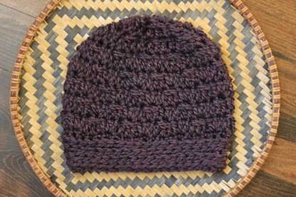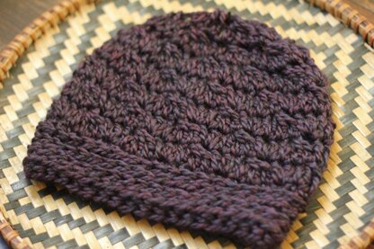 This is a cozy, squishy hat that uses combinations of DC clusters and shells to create a textured fabric reminiscent of water flowing over rocks and pebbles in a stream. The hat band is made with half double crochet stitches made into the “back bar,” or “horizontal bar,” which makes a flexible ribbed band. Each round of the hat body alternates placing 3 stitches in one stitch with stitching 3 stitches together (like a fan pointing upward followed by a fan pointing downward. Once you get the rhythm of it, this pattern, using bulky yarn (or two strands of worsted-weight yarn held double) and a large hook, just flies, and you have a finished hat in just an hour or two!