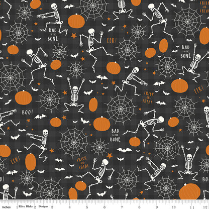 Bad to the Bone by My Mind's Eye for Riley Blake Designs is great for quilting, apparel and home decor. This print features skeletons, pumpkins, bats, spiderwebs, stars, and Halloween phrases on a tone-on-tone gingham background. Off white is glow in the dark.\nThis fabric is sold by the meter (m) rather than by the yard so you get a little extra. 1 yard = 36” and 1 meter = 39.