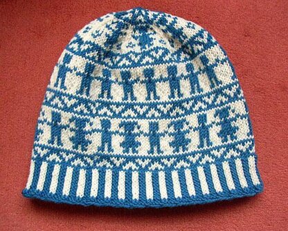 I had always wanted to make a beanie with this lovely pattern. Petrol and white seemed to be the perfect colour choice. However it will also look great in other colours (dark green and white, dark red and white, dark blue and white...). Can't wait to see what your beanie looks like.. Dancing boys and girls are all around this beanie, each band being different. The first band is with dancing boys and girls, the second with boys only and at the top there are only girls. And the peerie is some kind of zigzag. At the top there is a nice zigzag finish.