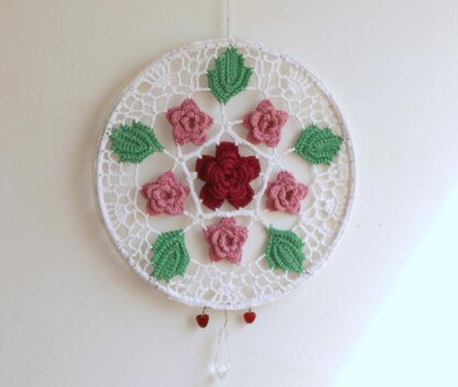 This ring of roses will look lovely all year long in a window or as a wall hanging. If the lead crystal drop is added it will create rainbows on the wall if hung from a southern window. In my house, because of the overhand from the roof, this happens all winter long to help get through those long winter months. The pattern includes description of abbreviations and complete instructions. The stitches include sc, hdc, dc, tr and back loop work. Contact information is on pattern if you have any problems, feedback or just want to show me how beautiful it looks. Finished Size: 8 inches (20.5cm) round diameter. You will need Boye Steel Crochet hook size 1 (2.25mm) and size 10 crochet cotton, a background color, a large rose color, small rose color and a leaf color. 8" Hoop Ring for dream catchers Optional items: Lead Crystal drop 24 gauge beading wire 2 head pins 2 red heart-shaped beads (or choice of bead color and shapes) US crochet terms used