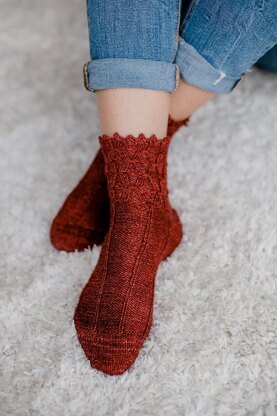 ConstructionThese socks are knit toe-up and have an afterthought heel. After creating the toe, we continue on pattern until a bit before the heel. We set up the heel placement and continue to the cuff that is decorated with these sweet Rings, called the Smocked Rib Stitch. We bind off creating a nice picot edge at the end. Video for all techniques are provided in the pattern.
