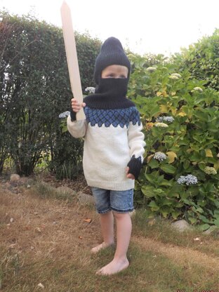 The sweater/pullover is worked from the bottom edge and up with a multi-colored pattern on the yoke. The sweater has a combined round and raglan yoke and sleeve construction. The Sweater has a folded sleeve rib with a thumb hole. The pattern includes instructions for working a “helmet” (Add additional 150-200 grams of yarn for the helmet).