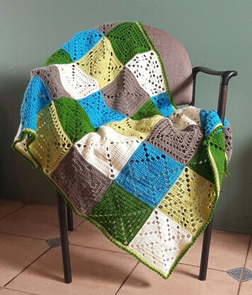 The pattern consists in 6 different granny squares that use simple filet crochet to create a fun blanket. The name of the blanket is inspired in Rio Celeste, a river in Costa Rica. It is notable for its distinctive turquoise coloration.