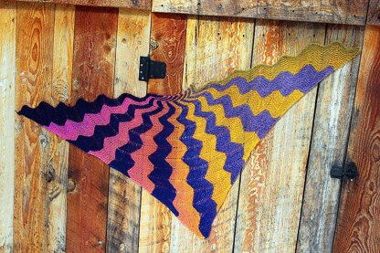 This shawl takes about 100g (400m) of fingering-weight total. After blocking, it measures 165cm at the widest part, and drops 70cm. For best result, use two contrasting gradient or gradient/solid yarn. Other patterns with similar technique: Doodle-Noodle, Mirage and Undine Sweater.