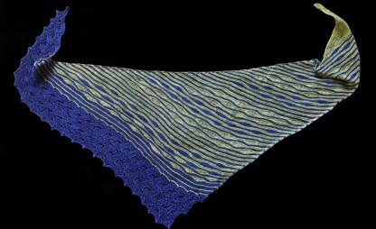 Undulating currents ripple through this fun shawl, creating impressive patterns by working short rows (Eddies) and elongated stitches (Bubbles). The latter are achieved by yarn-overs which are dropped in the return row.