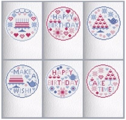 Counted Cross Stitch Card Kit to make 6 finished Birthday/Greetings cards.Included inside - 6 pre-cut fabric pieces of 14 count white Aida, 6 pieces of fusible (iron-on) backing fabric, 6-stranded Anchor embroidery threads, needle, charts, instructions, 6 high quality single-fold cards with a hammer effect to the outside and a smooth surface to the inside for writing on, 6 white envelopes (C6)