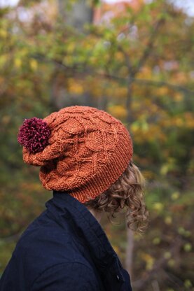 You can choose to wear the hat snug on the head and turn the brim up or you can wear it nice and slouchy. I recommend getting two skeins of yarn, so you can have both - and put a pom pom of the contrasting color on top of each!
