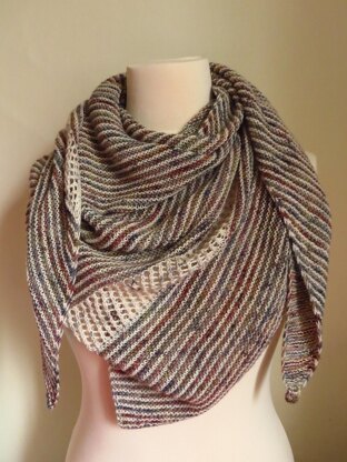 The Robina shawl is a triangle that is knitted sideways, starting with 4 stitches and growing into a shawl that is large enough to snuggle into. It uses 2 skeins of fingering/4 ply yarn, perfect for using a skein of special hand dyed yarn contrasted with a neutral or plain colour.