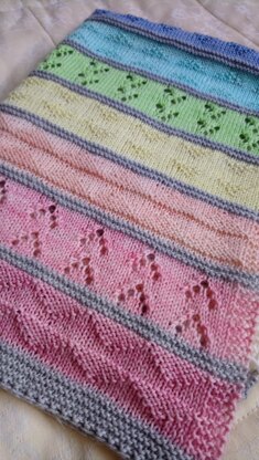 Yarn: Either 4ply or Dk may be used. Blanket can be done in one colour or stripes with main colour in between. 4ply: Stripes: 12 x 15/35/65/105/150m and MC: 90/120/230/380/430m One colour: 230/500/1000/1700/2400m DK: Stripes: 12x 20/45/80/140/195m and MC: 120/160/300/500/560m One Colour: 300/650/1300/2200/3100m Needles: 3mm (4ply) 3.75mm(DK)