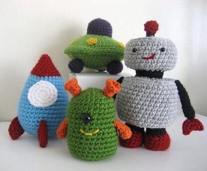 This pattern set will instrust you on my how to crochet my original patterns: robot, rocket ship, alien and UFO. This pattern set will need the following material: Size G Crochet Hook Worsted weight yarn One 12.00 mm black safety eye pair of 6 mm saftey eyes Yarn needle Polyfill stuffing Polyfill pellets (for robot)