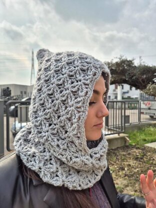 Con questo schema potrai realizzare un set composto da un collo con cappuccio e dei mezzi guanti in un'unica taglia da donna.