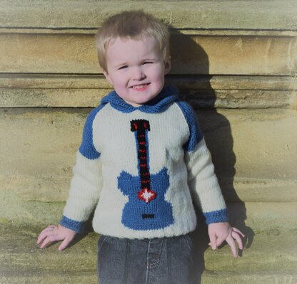 The sweater features a guitar on the front and the panels on the back, sleeves and hood are knitted in a contrast yarn. This is a striking, warm and trendy sweater for children from 2 to 12 years.