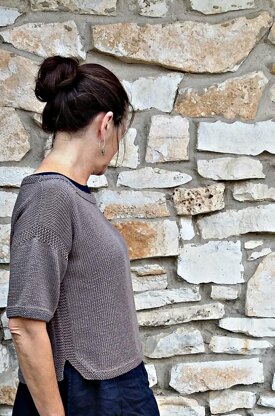 This simple boxy pullover is suitable for the knitter wanting to make her first sweater. Consisting of only knit and purl stitches with simple increases and decreases for shaping details. Techniques used include three needle bind off, picking up stitches and seaming. The front and back are knit from the bottom up and the three needle bind off is used for the shoulder seams. Stitches are picked up along the sides and the sleeves are knit down to the elbow. The sleeve length can be customized for the perfect fit. Stitches are picked up for the neckband and worked in the round. Side seams are sewn.