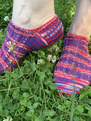 These simple, summery, shortie socks were designed to use a half-skein bonus the dyer sent me; the patriotic colorway gives us the name! The pattern is interesting in a variegated yarn or a solid, and there are modification instructions for a long pair as well.