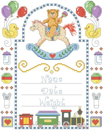 Designed by: Linda Gillum. Commemorate a very special date with this brightly colored boy's birth announcement. Framed with rubber ducks, rocking horse, train and charming toys. Designed with plenty of space to customize it using a newborn's details, it makes a wonderful memento and charming piece of nursery dГ©cor.