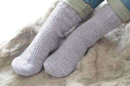 Cozy and delicate, the subtle stitch of the Rocky Mountain socks is nonetheless reminiscent of jagged mountain peaks, and, in this colour, the scent of lavender. Perfect for a warm evening indoors, or in a pair of hiking boots, these socks are sure to please your feet.