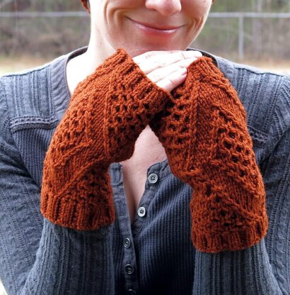 Simple 2-stitch cables form concentric diamonds on a honeycomb background in the Roelle Gloves. The back of the glove features a rib-filled diamond for additional elasticity. A classic worsted weight yarn makes the Roelle Gloves a fast and fun knit.