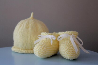 The rolled brim on the beanie, and rolled top on the booties give a slightly more modern touch to this classic baby gift set. Simple ribbon ties on the booties ensure that these wee shoes will stay on!