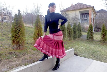 There are 5 sections of the skirt in the form of ruffles. Sections 1, 2, 4 and 5 are knitted, while Section 3 is a rectangular piece of fabric that is sewn onto Sections 2 and 4. Between each section there is a lace border knitted in 5 rounds. Sections 1 and 2 are knitted to fit your hip measure, and they tightly wrap your body around. Sections 3, 4 and 5 are wider than each section before, thus forming ruffles and flare.