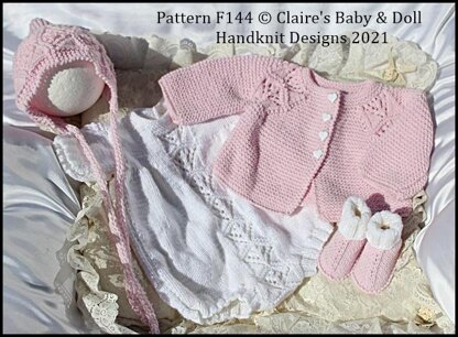 Knitting pattern for a romper, jacket, bonnet and boots. The romper, jacket and hat all feature a pretty lacy panel. The jacket is knitted in one piece, so only sleeve and side seams to sew, and buttonbands are knitted in too. The bonnet is a simple hood style knitted in one piece. The boots are just too cute!