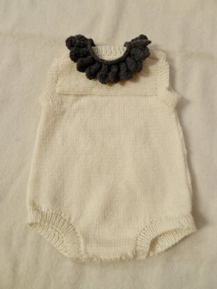 This little baby romper is a perfect gift for a new baby. The detachable lace collar means it can be jazzed up a bit for a special outing . Knitting in pure wool baby 4 ply it is very soft and is not a difficult knit and is equally suitable for a boy or girl. The bodice can be knitted in garter stitch as shown here or you could leave it plain in stocking stitch with just a little garter stitch border around the armholes. It is quite versatile. Change the colour of the collar to suit.