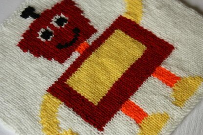 Ronnie the robot is a blanket square pattern featuring a full intarsia tutorial with lots of photographs to help you. The pattern also contains sections on Swiss darning (duplicate stitch) and blocking.
