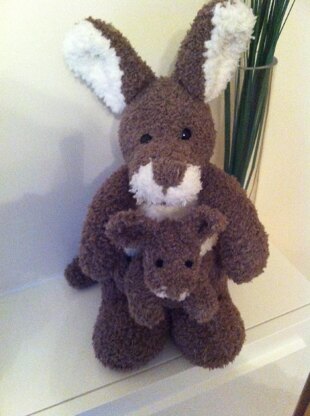 At last I present you Roo Roo kangaroo and her baby . She is made with rico baby teddy aran on 3mm needles . other yarn such as sirdar snowflake and bernat pipsqueak can be used and would be knitted on 3.5mm needles . Knitted straight and seemed together.