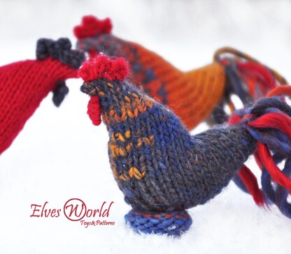 The rooster is knitting flat on two needles and later seamed. The finished size is approximately 3 inches (7.5 cm) high. This is a very quick and easy project. This cute rooster can be an original gift for Christmas.