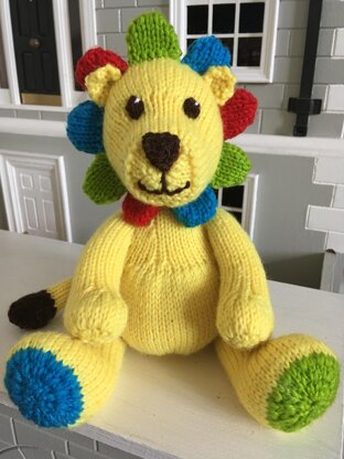 Rory, the lion is a colourful little character, with his multicoloured paws and mane. He is knitted flat and is fairly easy to make.