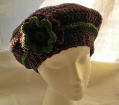 A very fashionable crocheted beret. It is trimmed with a contrasting color and has an added, 2-color flower. This beret pattern crochets up quickly and the results are beautiful. A medium worsted weight yarn in plum and green was used. A fuzzy yarn would be gorgeous as well, just be sure to check your gauge.