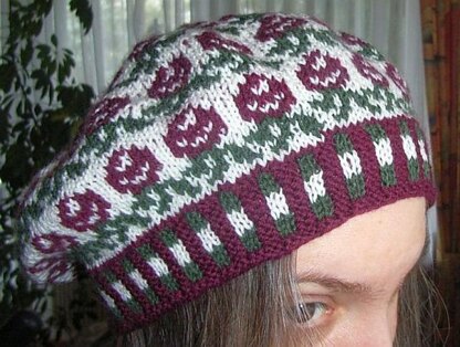 Some time ago I was searching the Ravelry patterns for a rose beret. It should have been a special kind: roses and leaves in rounds around a beret. As I couldn't find anything like this I had to make my own pattern. And I love all about it! It is knit in three colours, has a corrugated ribbing, bands of roses and their leaves around the body section and at the top is a beautiful single rose. And there are at most two colours in one row. I knit it three times and it's one of my easier patterns (the rose pattern is easy to remember).