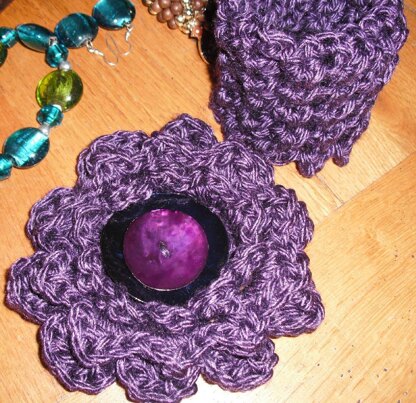 A large rose corsage and cuff made of the most beautiful yarn. The corsage is about 12cm across and can be worn on it's own or added to the simple cuff which is in a nicely textured stitch. Written instruction. In English crochet terms.