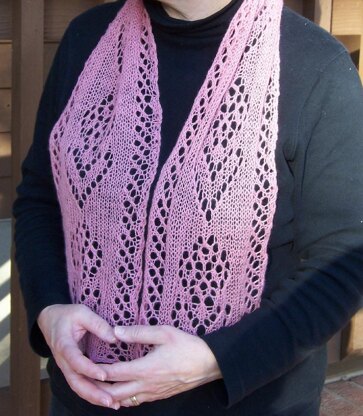 This elegant scarf has a lovely, floral lace design going up both sides to meet at the center back (which is ribbed to hug the neck). A lacy trellis borders either side of this gorgeous scarf that is knit in two-halves and joined in the center. The directions are both charted and row-by-row.
