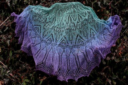 This half-pi shawl is worked from the top down, and requires only the following stitches: k, p, yo, k2tog, ssk, s2tog-k1-p2sso (explained in pattern). Lace sections are presented in both charted and written form.