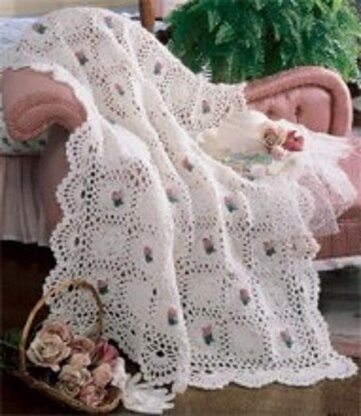 Leisure Arts ePattern Best of Terry Kimbrough Afghans Rosebud Afghan - Terry Kimbrough created this timeless patterned afghan with beautiful coordinating borders. Made with worsted weight yarn and crochet hook US size H. Includes instructions for creating treble crochet, cluster, popcorn, and scallop stitches. Finished size measures approximately 43 1/2"x 63 1/2". Originally published in 3209 Best of Terry Kimbrough Afghans. 8 pages, PDF download.